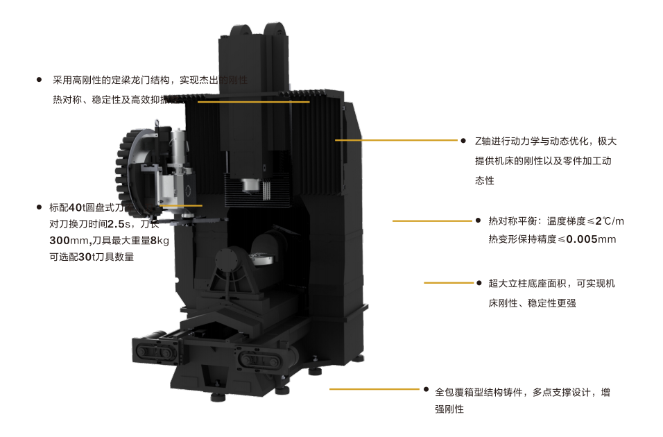 GMU400E采用定梁式高刚性龙门框架,P级精度高刚性35mm滚柱导轨,通过搭配高性能电主轴及双齿轮消隙传动的高刚性AC摇篮转台(特设独有扭转阻尼机构削弱扭转振动),结合丝杆中空冷却技术,可满足加工材料的通用性,对模具、精密零件、汽车配件行业的高效、高精度加工需求提供信心保证。