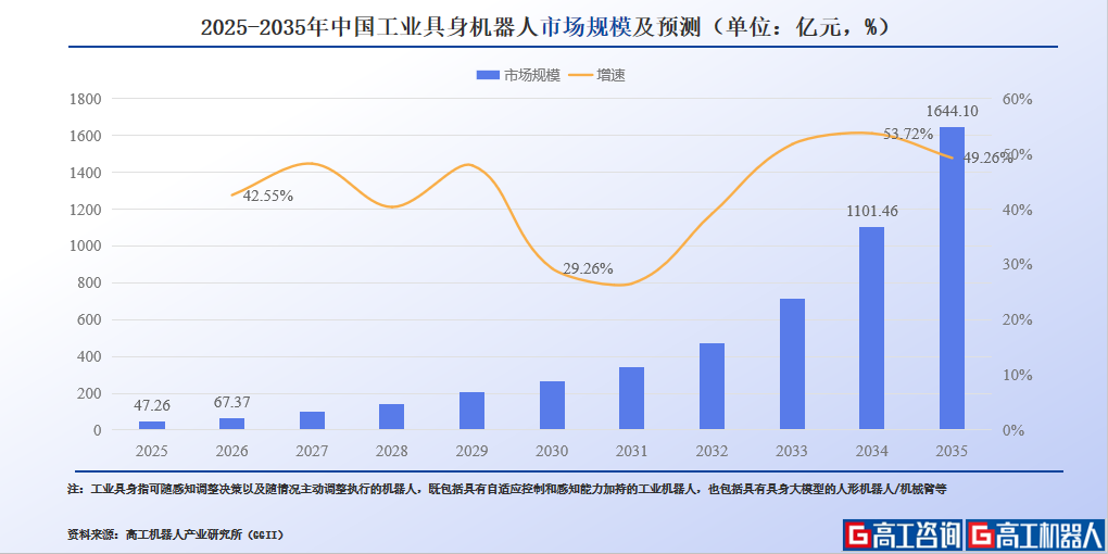 “不具身,無未來”正成為機器人行業的共識。據GGII數據,2025年我國工業具身機器人市場規模約47.3億元,而到2035年,這一數字有望達到1644.1億元,年複合增長率高達42.3%。